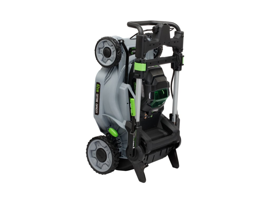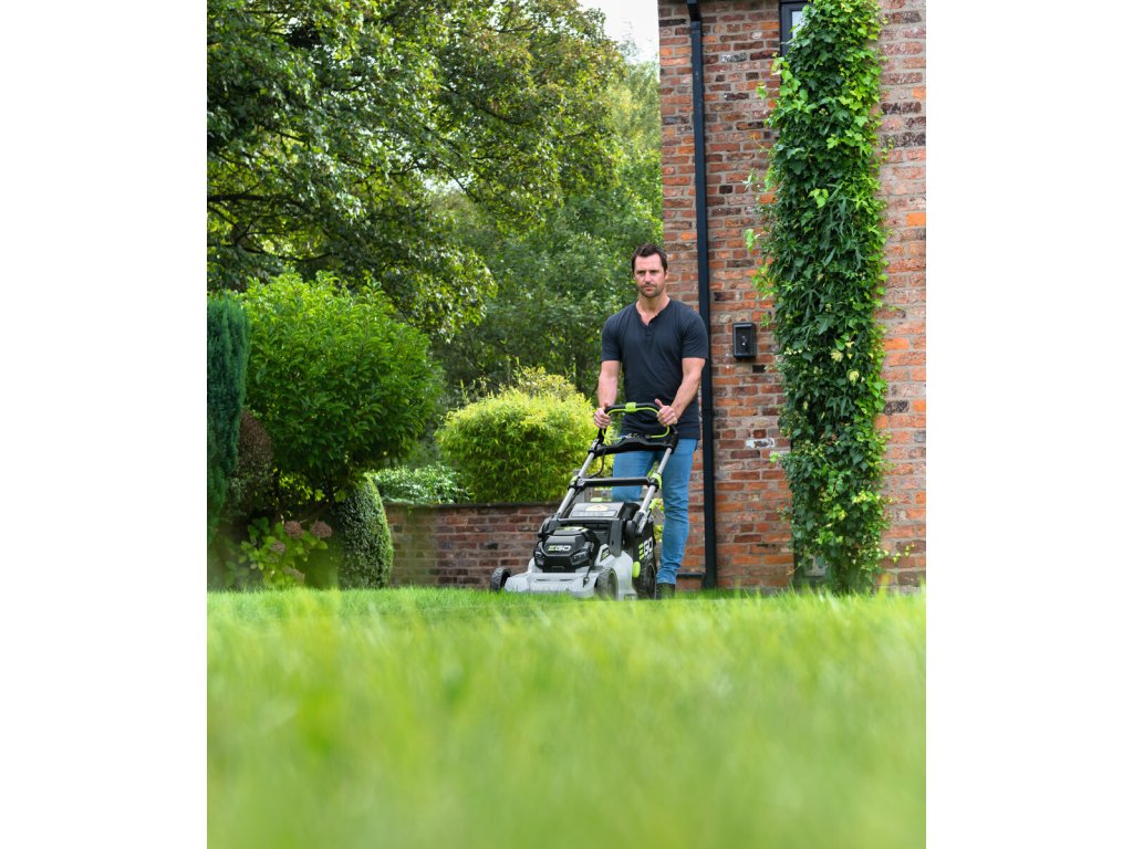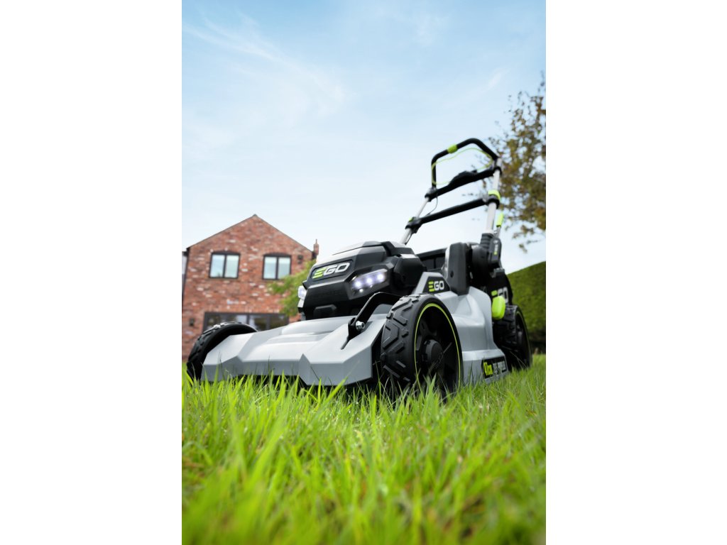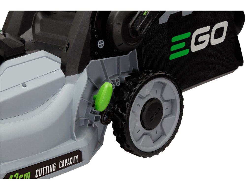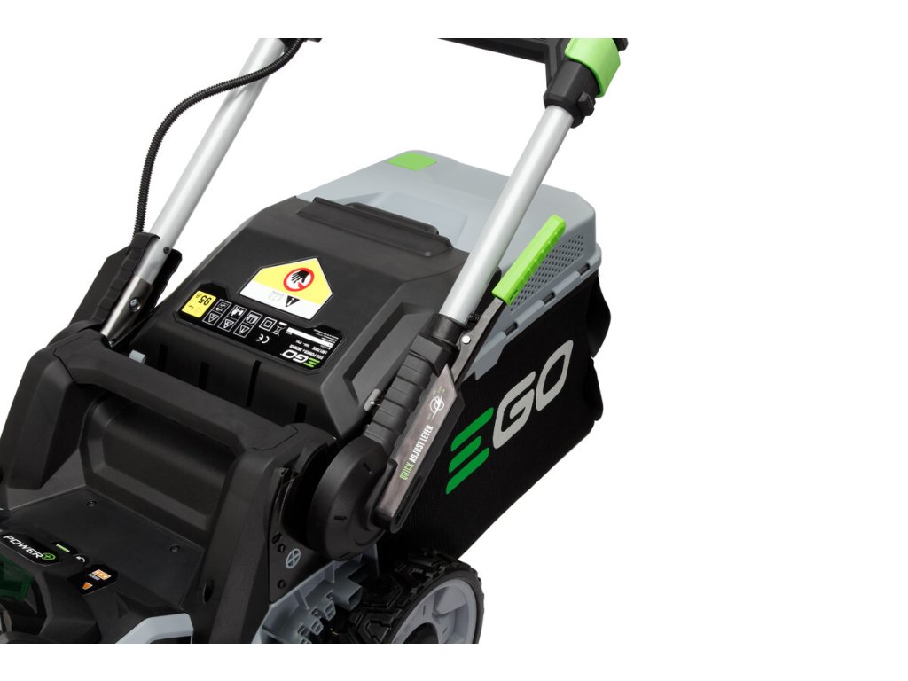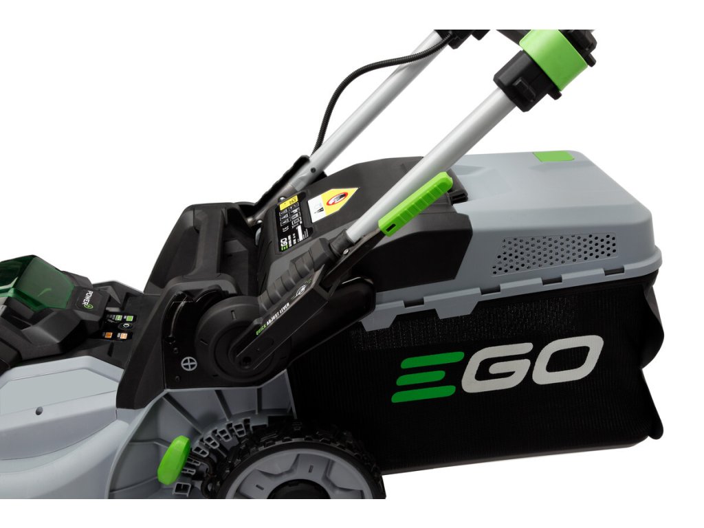 Model EGO LM 1700E-SP - záběr sečení 42cm a plynule proměnlivý pojezd, objem sběrného koše 55L, teleskopická a výškově nastavitelná komfortní rukojeť.