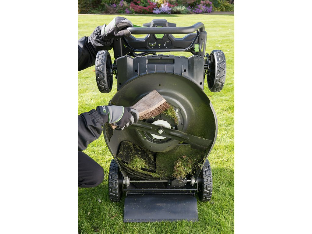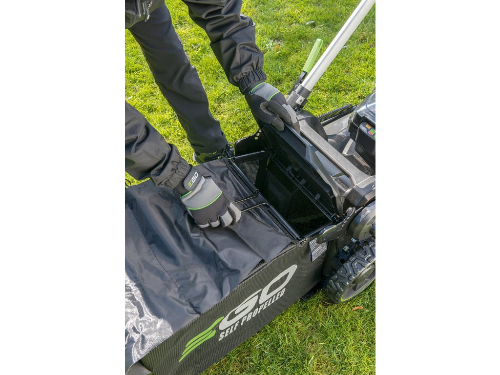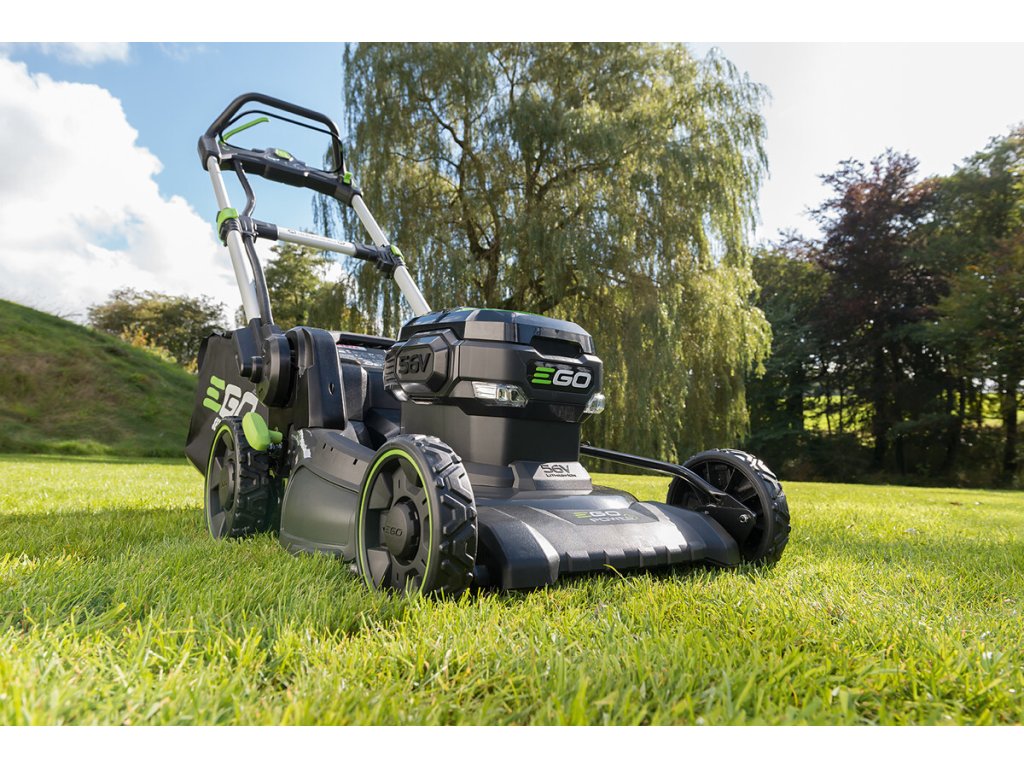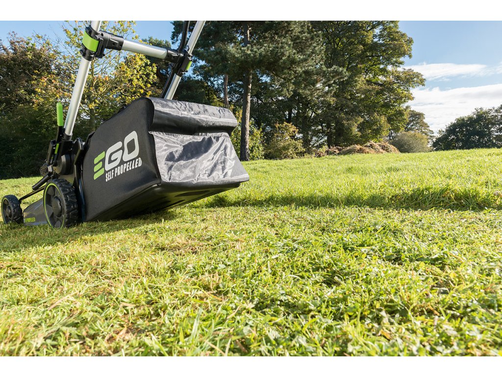 Model EGO LM 2020E-SP - záběr sečení 50cm, ocelový podvozek a plynule proměnlivý pojezd, objem sběrného koše 60L, teleskopická a výškově nastavitelná komfortní rukojeť.
